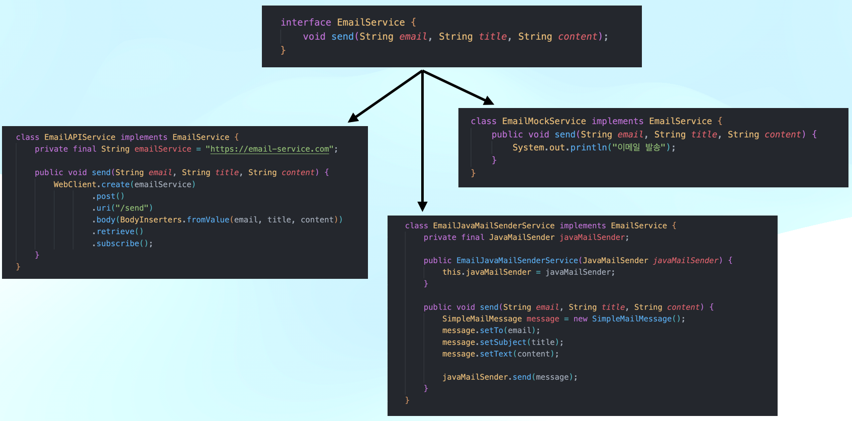 인터페이스를 통해 이메일을 보내는 로직을 추상화한 EmailService는, 그 어떤 녀석이든 될 수 있다.