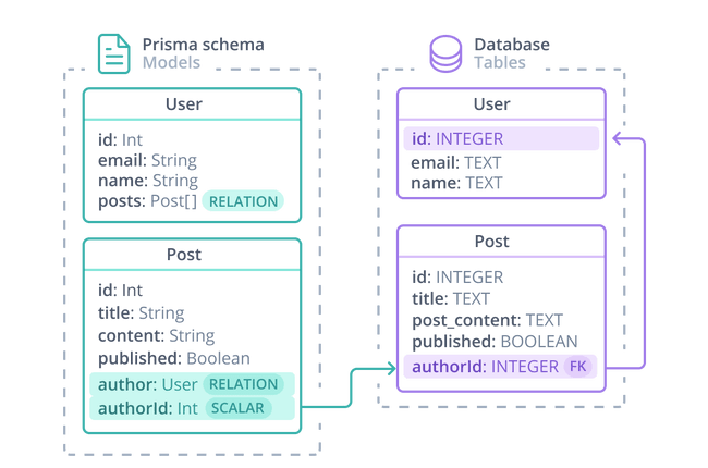 @relation속성에 의해 참조되는 스칼라authorId필드. 이 필드는 데이터베이스 테이블에 존재하며,Post와User를 연결하는 FK입니다.- 두 관계 필드인