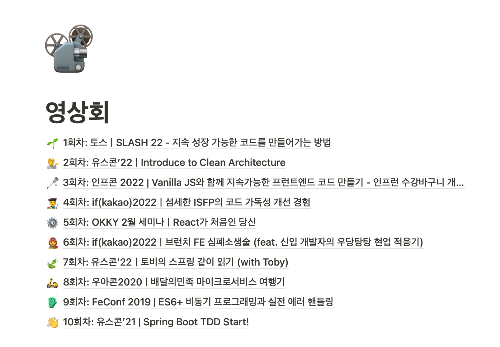 추가적으로 회사 내에 직원들의 역량 향상을 위해 다양한 시도도 해보았다. 회사 직원들을 모아 다양한 세미나도 진행해보았고 (그 중 일부는 블로그에도 포스팅했다) 영상회라는 것도 진행하였다.