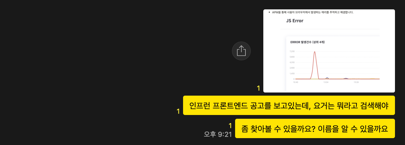 예를 들어.. 운영팀에서 나가기 직전의 타이밍 즈음에, 인프런의 채용 공고를 보다가 (인프런에 지원하려고 보던 것은 아니고, 평소에 인프런의 채용공고가 굉장히 잘 쓴 공고라고 생각해서 종종 읽어본다) "사용자 브라우저에서 발생하는 에러를 추적하고 해결합니다"라는 문구를 발견했었다.