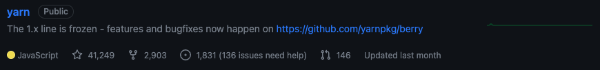 마침 기존 저희 회사의 서비스는 yarn 1.x 버전의 패키지 매니저를 사용해왔는데, 현재 yarn 1.x 버전은 유지보수만 이루어지는 레거시 프로젝트가 되었습니다. 즉, 굳이 모던 레거시를 만들 필요도 없다 생각하여 berry로 마이그레이션 하는 것이 바람직하다고 생각했습니다.