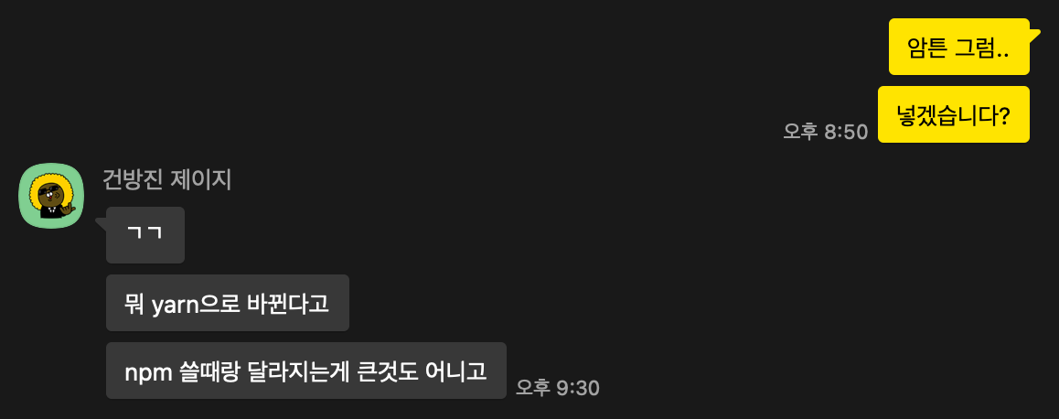 분명 좋은 일이지만.. 결국 yarn을 사용하기 위해서 깔아야 하는 추가 의존성이 생긴 것이니 좀 껄끄러운 면이 있었습니다.