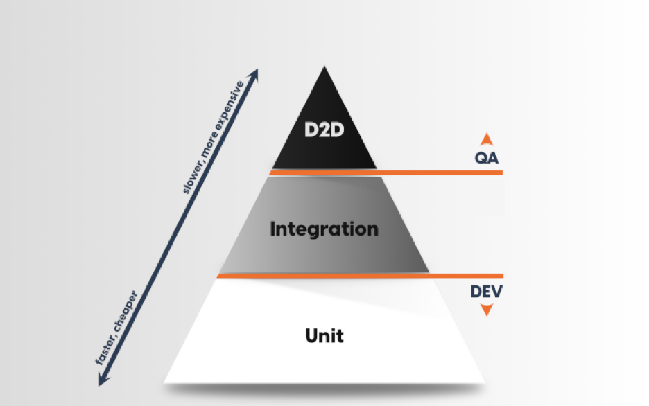 테스팅 피라미드는 기능 회귀 테스트에 접근하는 방법에 대한 일반적인 지침입니다. 이 피라미드에서는 단위 테스트를 가장 아래에, 통합 테스트를 중간에, D2D 테스트를 가장 위에 배치합니다. 단위 테스트가 더 빠르고 안정적이기 때문에 단위 테스트에 가장 중점을 두어야 하는 반면, D2D 테스트는 가장 덜 중점을 두어야 하며(훨씬 느리고 훨씬 더 허술합니다) 통합 테스트는 그 중간 어딘가에 위치해야 한다는 이유에서입니다.
